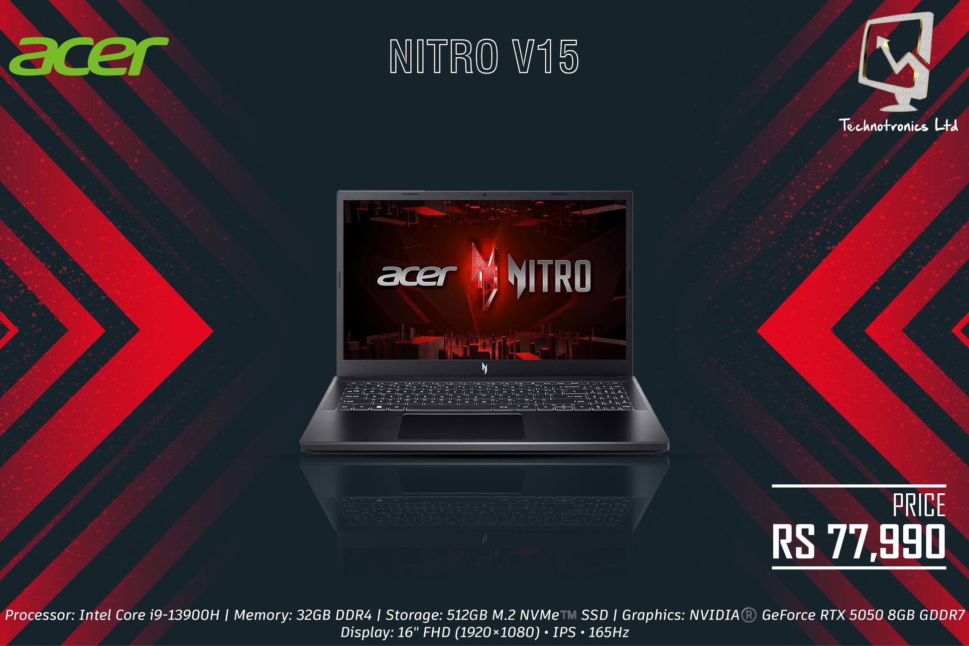 ACER NITRO V15 | Processor: Intel Core i9-13900H | Memory: 32GB DDR4 | Storage: 512GB M.2 NVMe™️ SSD | Graphics: NVIDIA®️ GeForce RTX 5050 8GB GDDR7