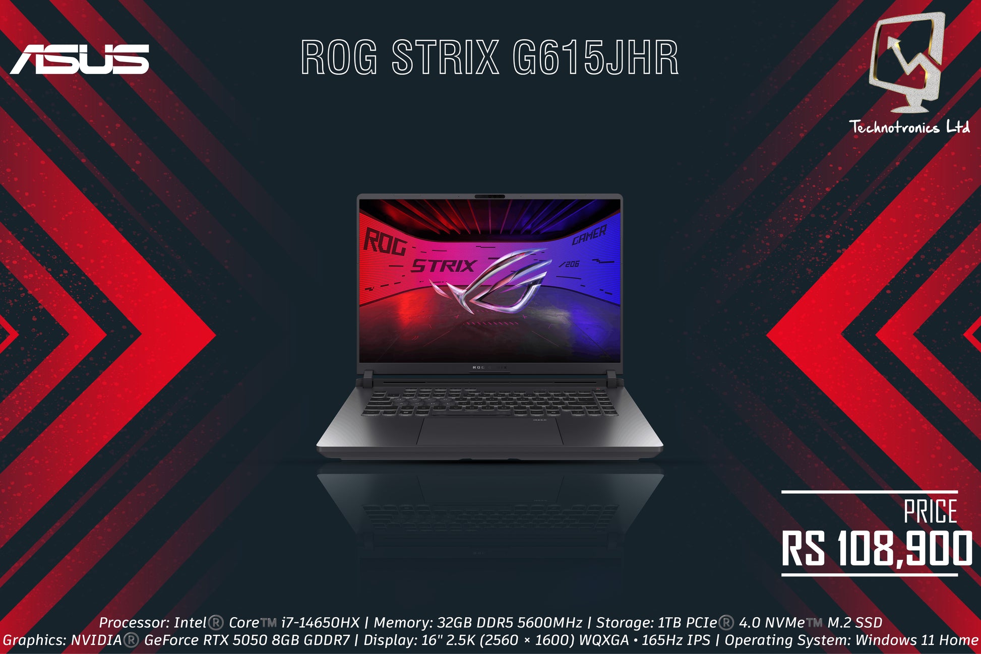 ASUS ROG STRIX G615JHR | Processor: Intel®️ Core™️ i7-14650HX | Memory: 32GB DDR5 5600MHz | Storage: 1TB PCIe®️ 4.0 NVMe | Graphics: NVIDIA®️ GeForce RTX 5050 8GB GDDR7 |