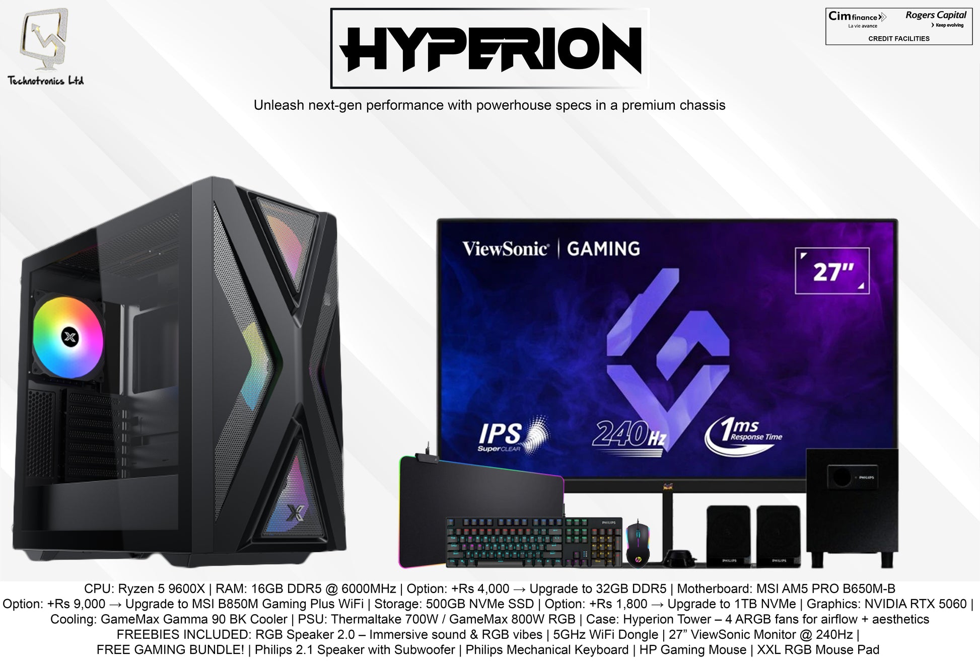 HYPERION GAMING SET | CPU: Ryzen 5 9600X | RAM: 16GB DDR5 | Storage: 500GB NVMe SSD | Graphics: NVIDIA RTX 5060