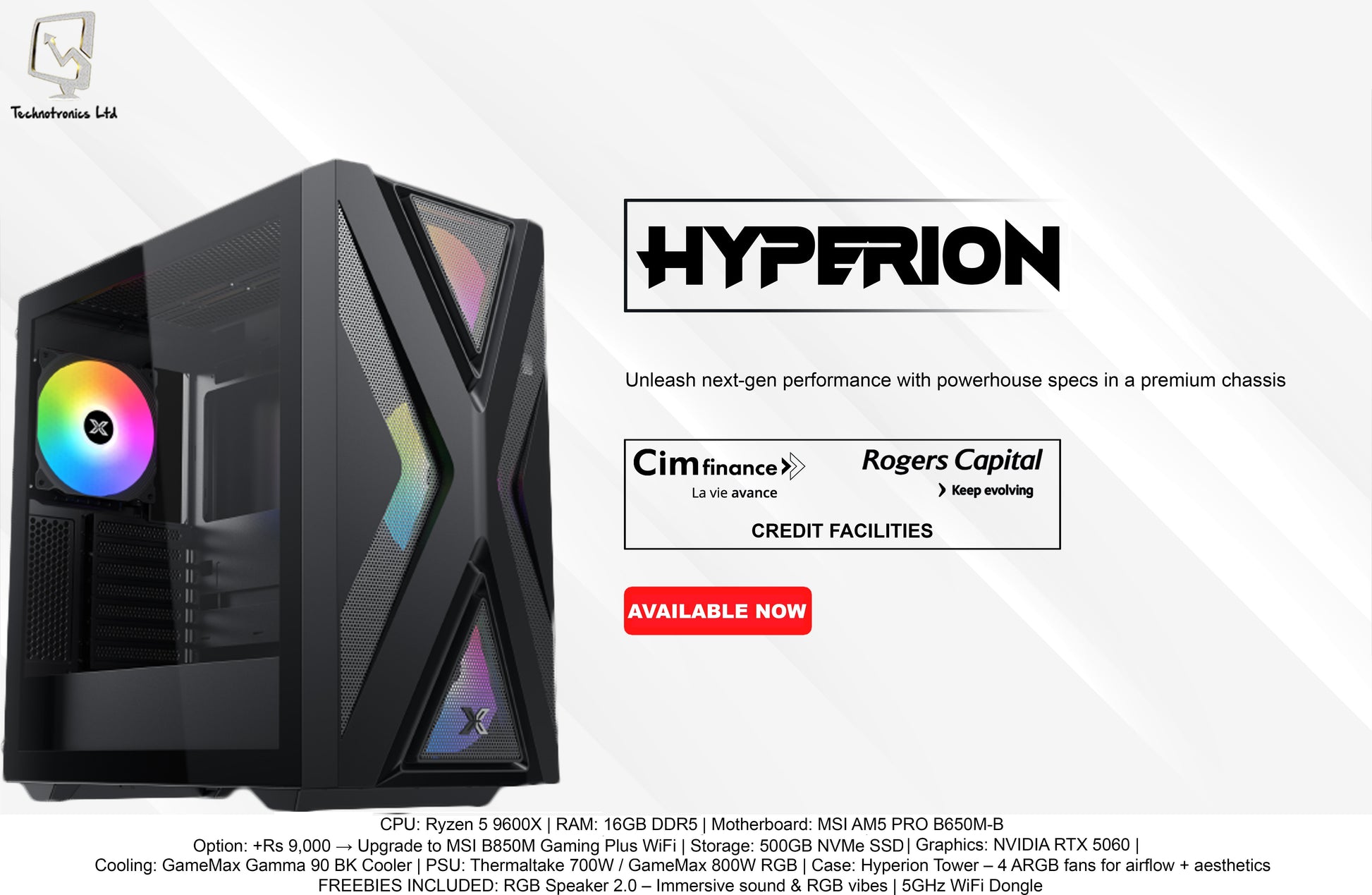 HYPERION GAMING TOWER | CPU: Ryzen 5 9600X | RAM: 16GB DDR5 | Storage: 500GB NVMe SSD | Graphics: NVIDIA RTX 5060