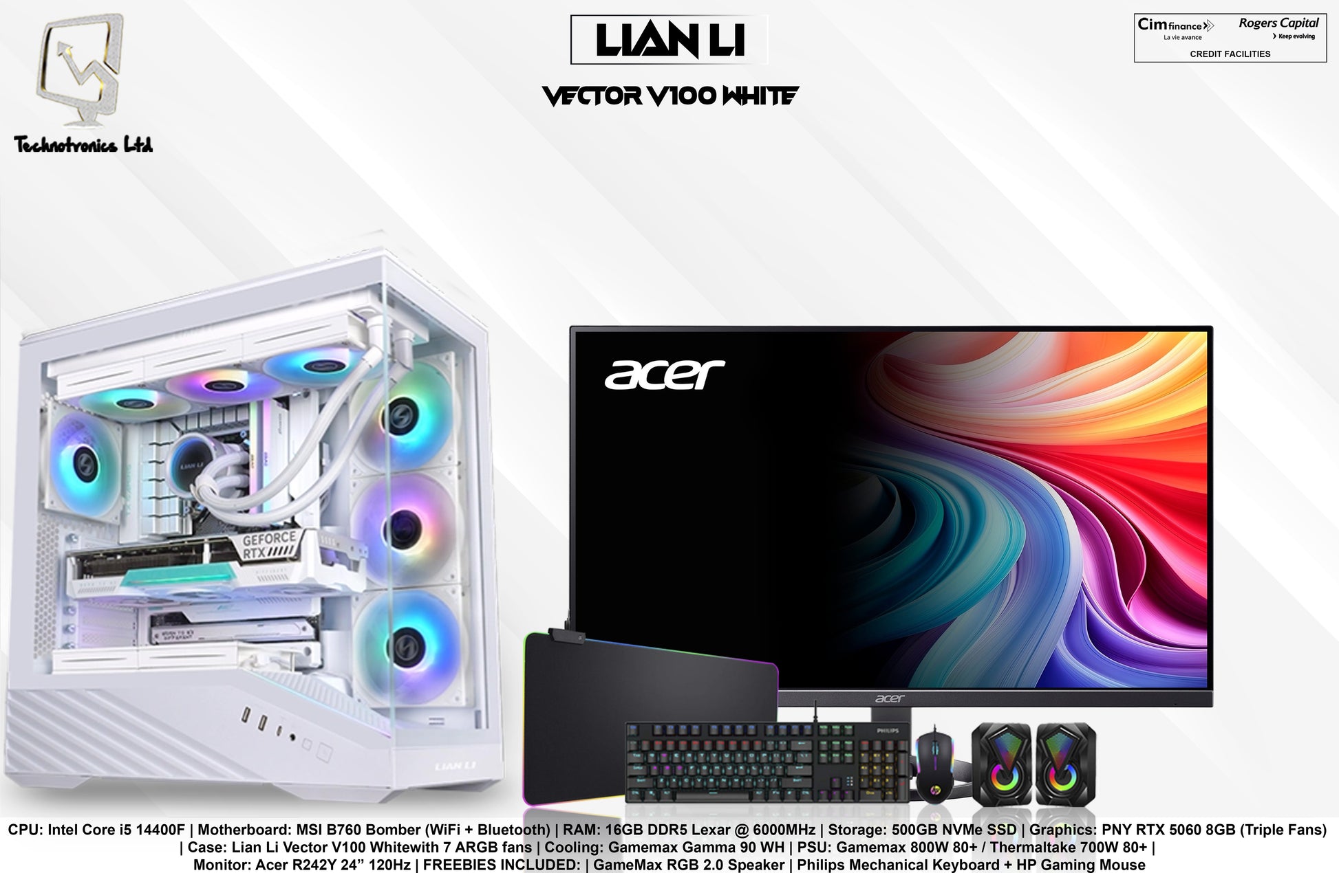 Lian Li Vector V100 White Edition Gaming Set | CPU: Intel Core i5 14400F | RAM: 16GB DDR5 | Storage: 500GB NVMe SSD | Graphics: PNY RTX 5060 8GB (Triple Fans)