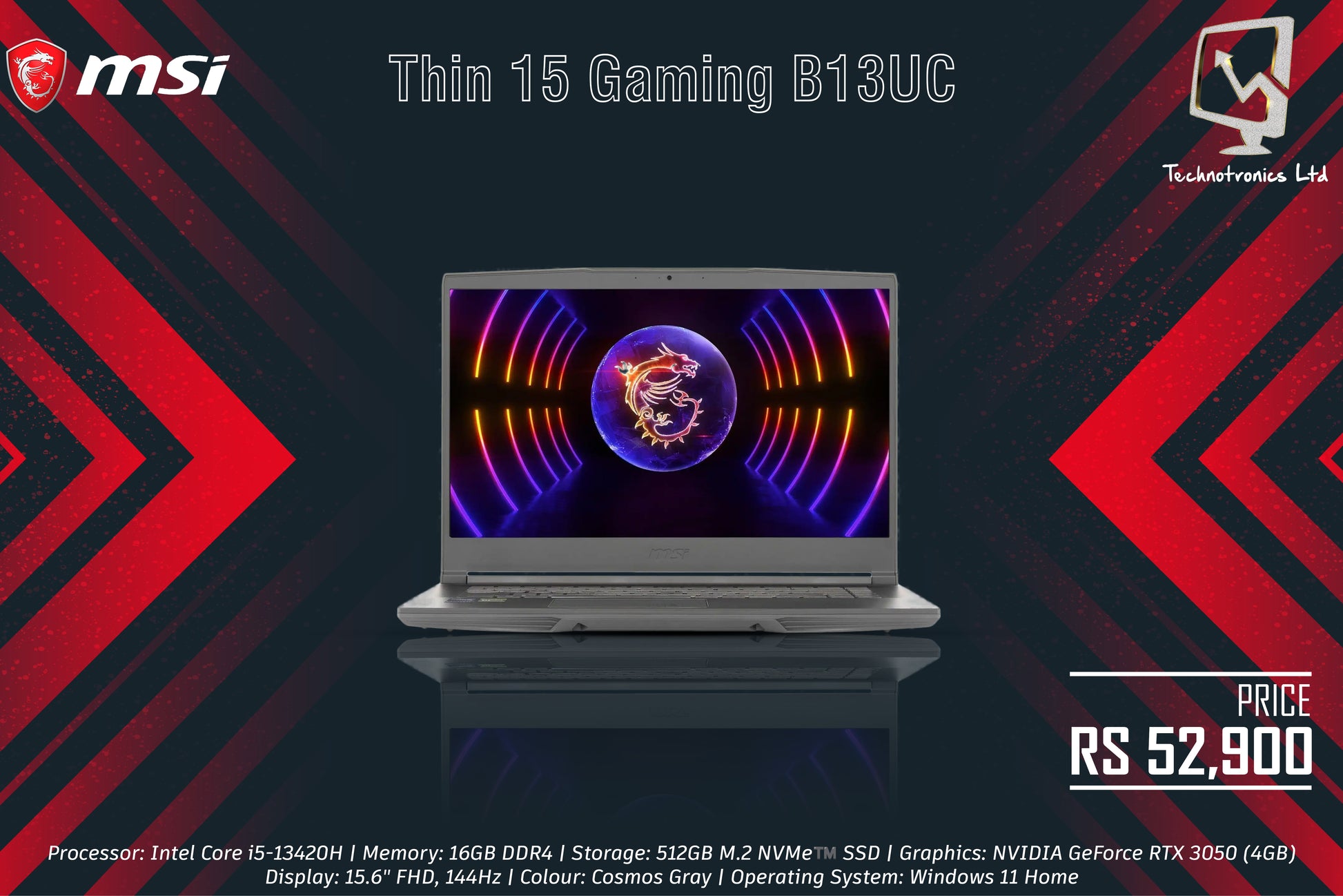 MSI Thin 15 Gaming B13UC-1000US | Processor: Intel Core i5-13420H | Memory: 16GB DDR4 | Storage: 512GB M.2 NVMe™️ SSD | Graphics: NVIDIA GeForce RTX 3050 (4GB)