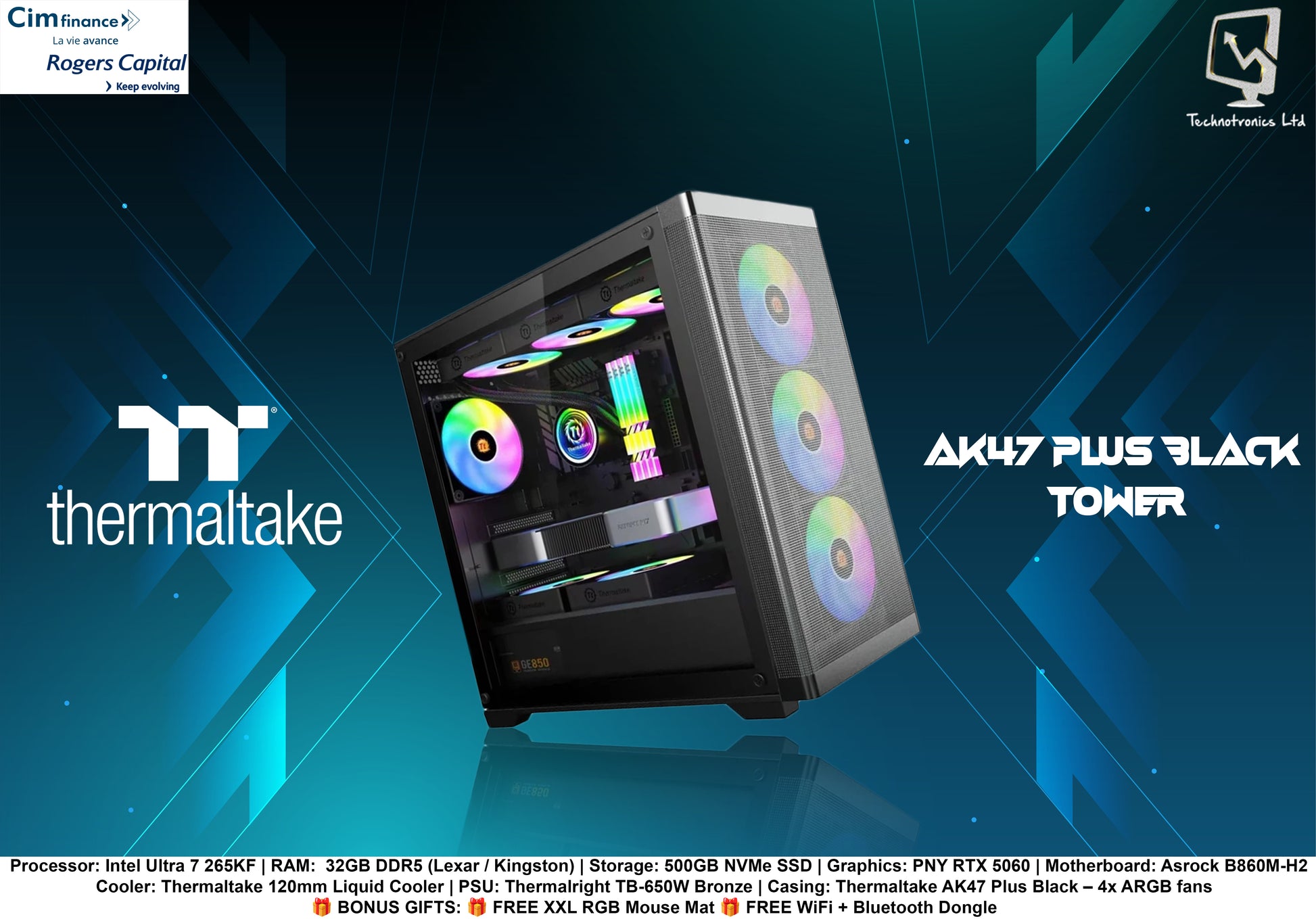 Thermaltake AK47 Plus Black Tower | Processor: Intel Core Ultra 7 265KF| RAM:Kingston 32 GB DDR5 @ 6400MHz | Storage: 500GB NVMe SSD | Graphics: PNY RTX 5060