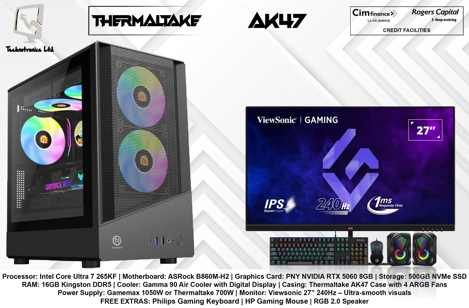 Thermaltake AK47 Set | Processor: Intel Core Ultra 7 265KF | Storage:1 TB NVMe SSD | RAM: 32GB Kingston DDR5 | Graphics Card: PNY NVIDIA RTX 5060 8GB
